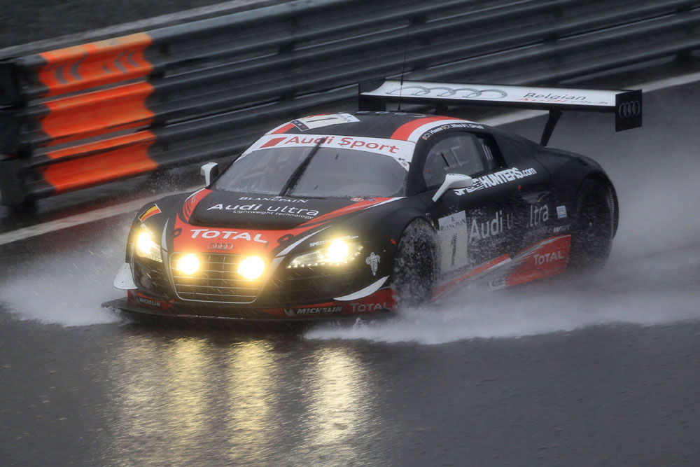 Nach einer schwierigen ersten Rennstunde konnten sich die Audi R8 LMS ultra nach einer Korrektur des Reifendrucks Position um Position verbessern und die zunächst führenden BMW unter Druck setzen. Die ersten Führungskilometer sammelte Audi in der vierten Stunde. Ab der neunten Stunde übernahmen die Audi R8 LMS ultra in Spa endgültig das Kommando – und das bei teilweise extrem schwierigen Bedingungen mit sintflutartigen Regenfällen, minimaler Sicht und insgesamt 16 Safety-Car-Phasen.