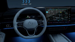 Der großzügige und hochwertig ausgeführte Innenraum bietet sowohl auf den vorderen als auch hinteren Sitzplätzen ausgesprochen viel Platz. Das Cockpit wurde komplett neu konzipiert und die klassischen Instrumente deutlich verkleinert. Alle notwendigen Standardinfos und Warnmeldungen werden im ID. Cockpit hinter dem Lenkrad angezeigt. Weitere wesentliche Informationen erhält der Fahrer über das serienmäßige Augmented Reality Head-up-Display. Mittelpunkt des Anzeigen- und Bedienkonzepts ist das im ID.7 serienmäßige 38 Zentimeter (15 Zoll) große Infotainmentdisplay, dessen Bedienkonzept grundlegend überarbeitet wurde. Auf Basis von Kundenfeedback wurde beispielsweise die Klimabedienung permanent in die erste Bedienebene intergiert. Ebenso gibt es frei konfigurierbare Direkteinstiegstasten.